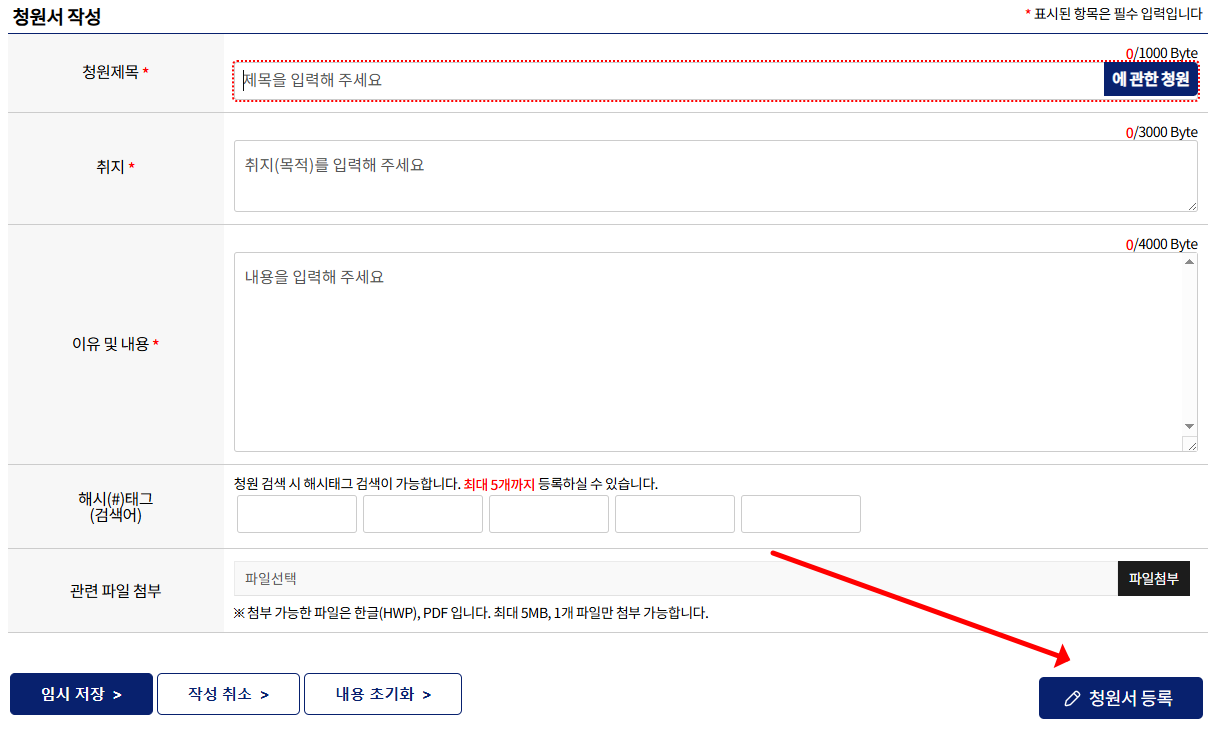 | 3단계 | 청원 제목 및 내용 작성 | 자유 형식 (단, 법안 요구는 구체적일수록 좋음) |
